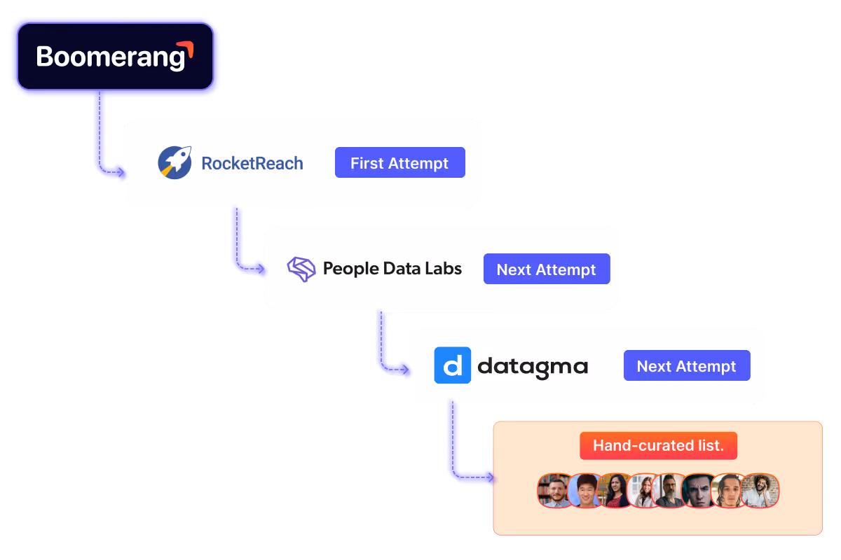 Unlike static enrichment tools, Boomerang analyzes your past closed-won deals and Gong/Outreach data to identify the actual personas involved. By learning the specific titles and roles that move your deals forward, Boomerang builds a custom waterfall enrichment strategy that results in 20% higher coverage than standard providers.